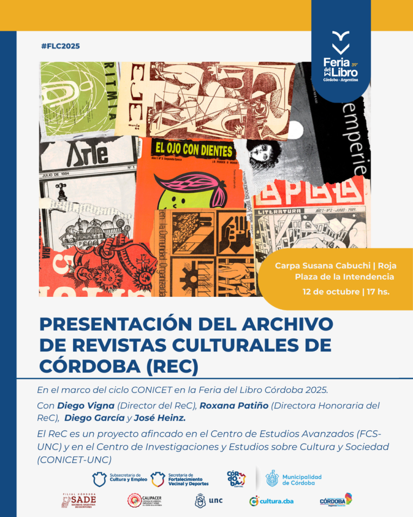 El domingo 12 de octubre, a las 17 horas, presentamos el ReC en el ciclo de charlas sobre proyectos de CONICET que organiza la Feria del Libro Córdoba 2025. Será en la Carpa Roja, bautizada con el nombre de la poeta Susana Cabuchi, ubicada en la Plaza de la Intendencia (Ciudad de Córdoba). Participarán de la charla Diego Vigna (Director), Roxana Patiño (Directora Adjunta), Diego García y José Heinz. Los esperamos.